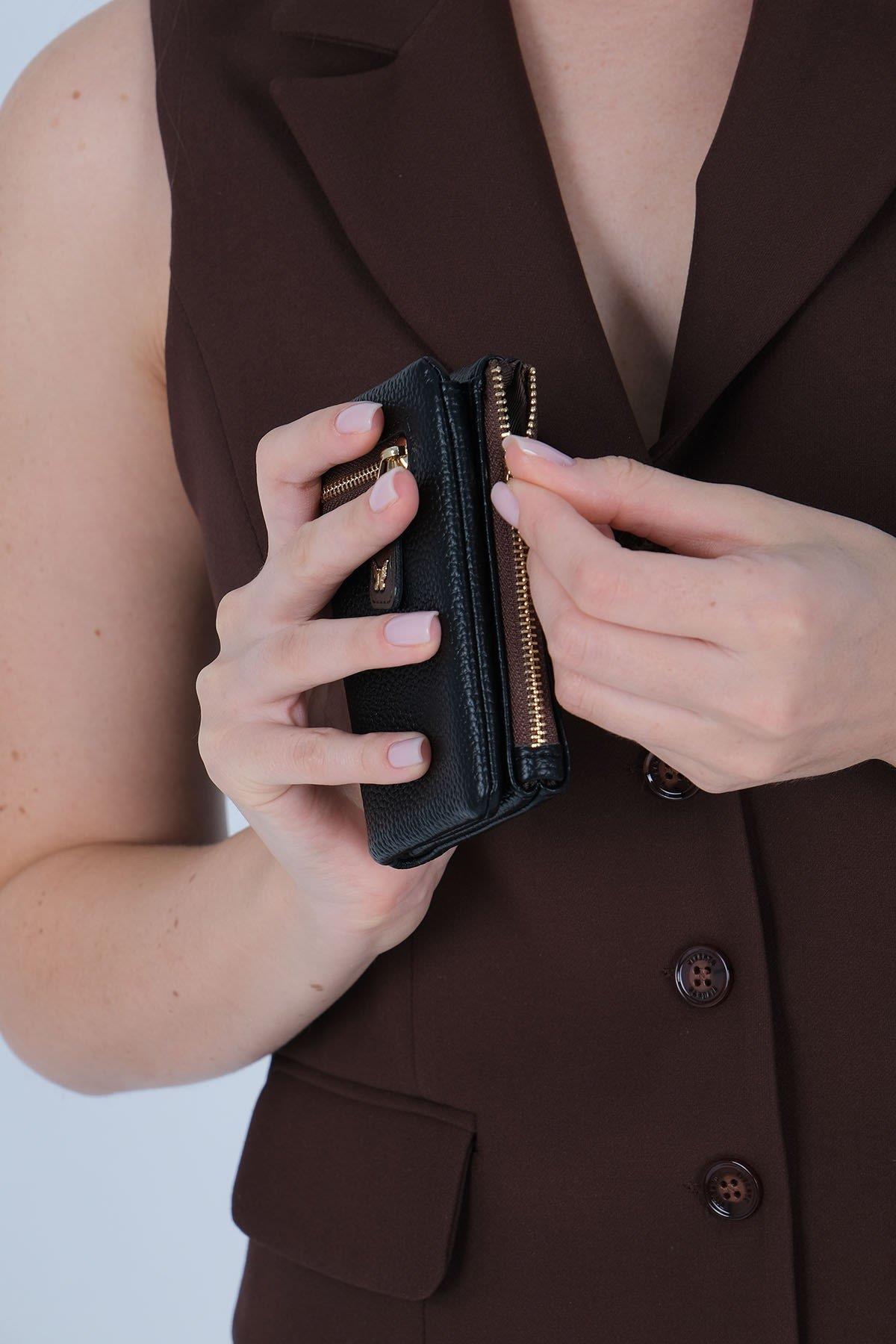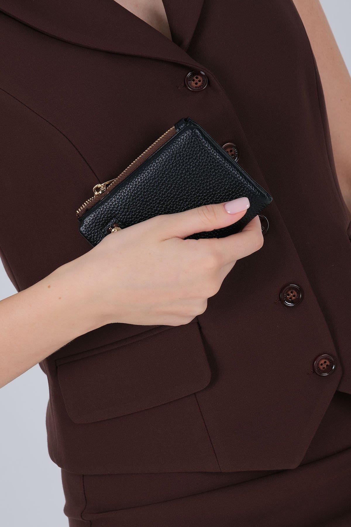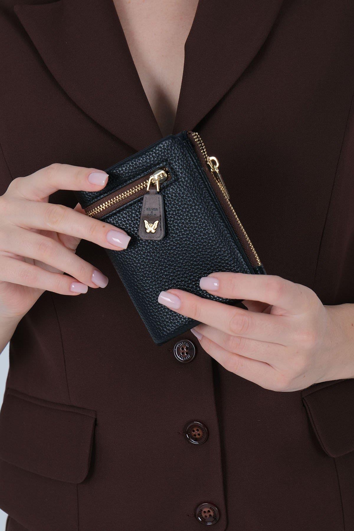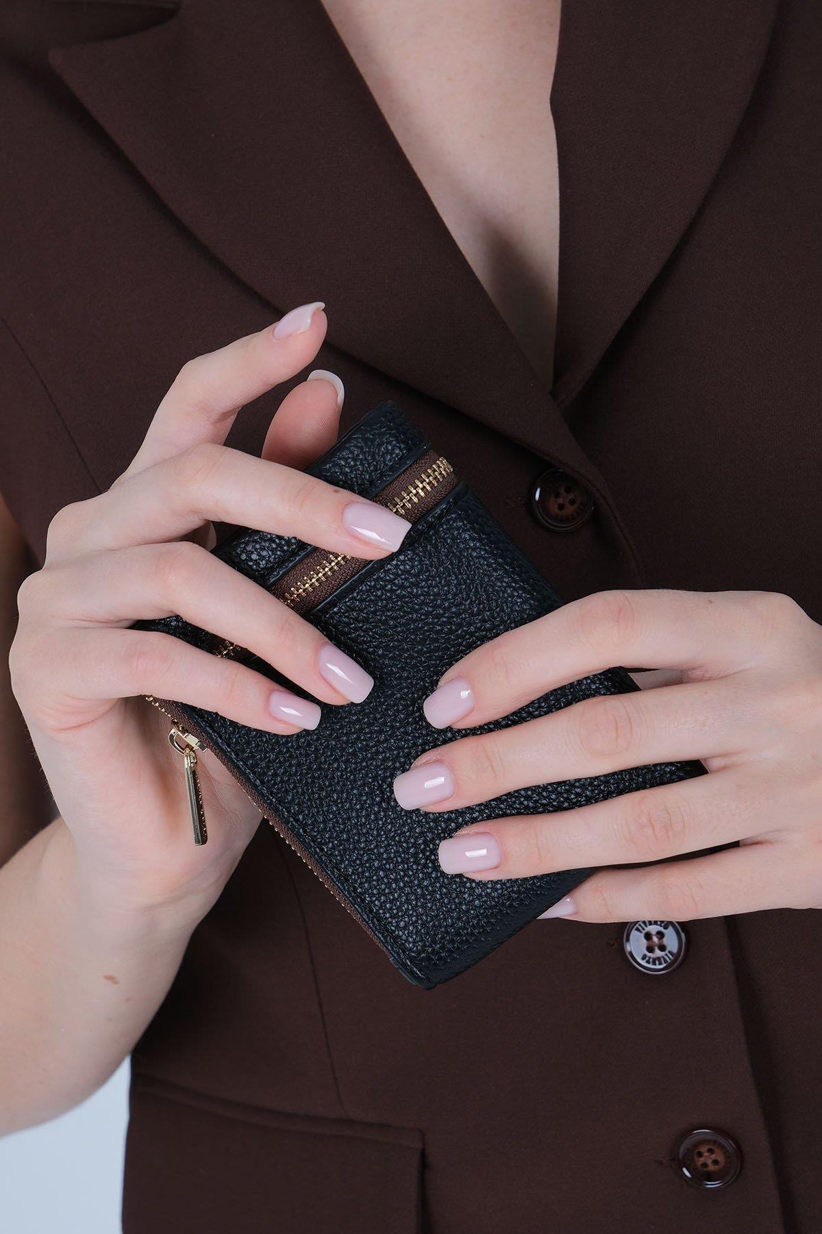 Портфейлът разполага със 7 слота за карти, 1 вътрешно отделение за банкноти и 2 външни отделения с цип, подходящи за пари и монети. Златистите метални аксесоари придават елегантен и модерен завършек.